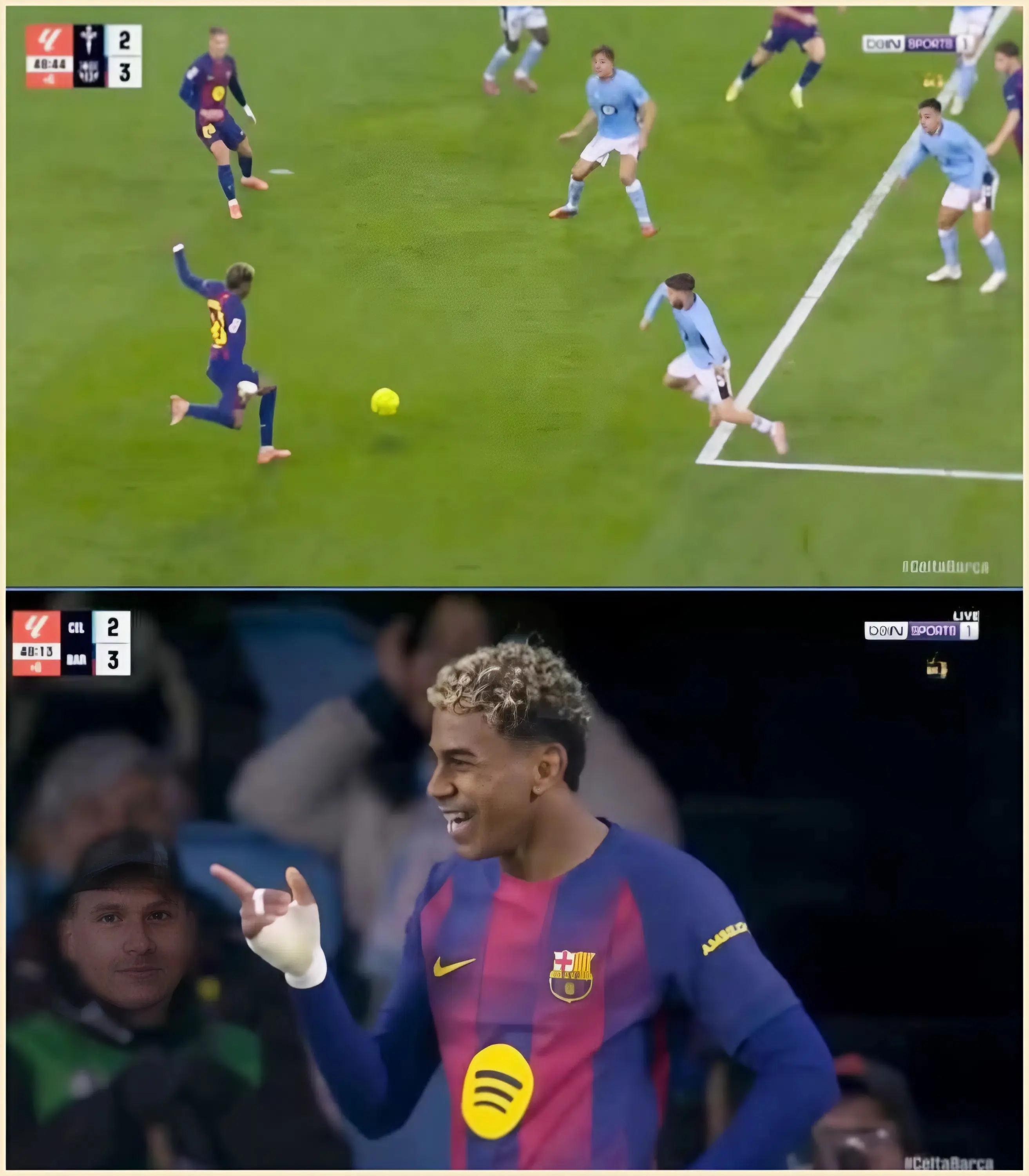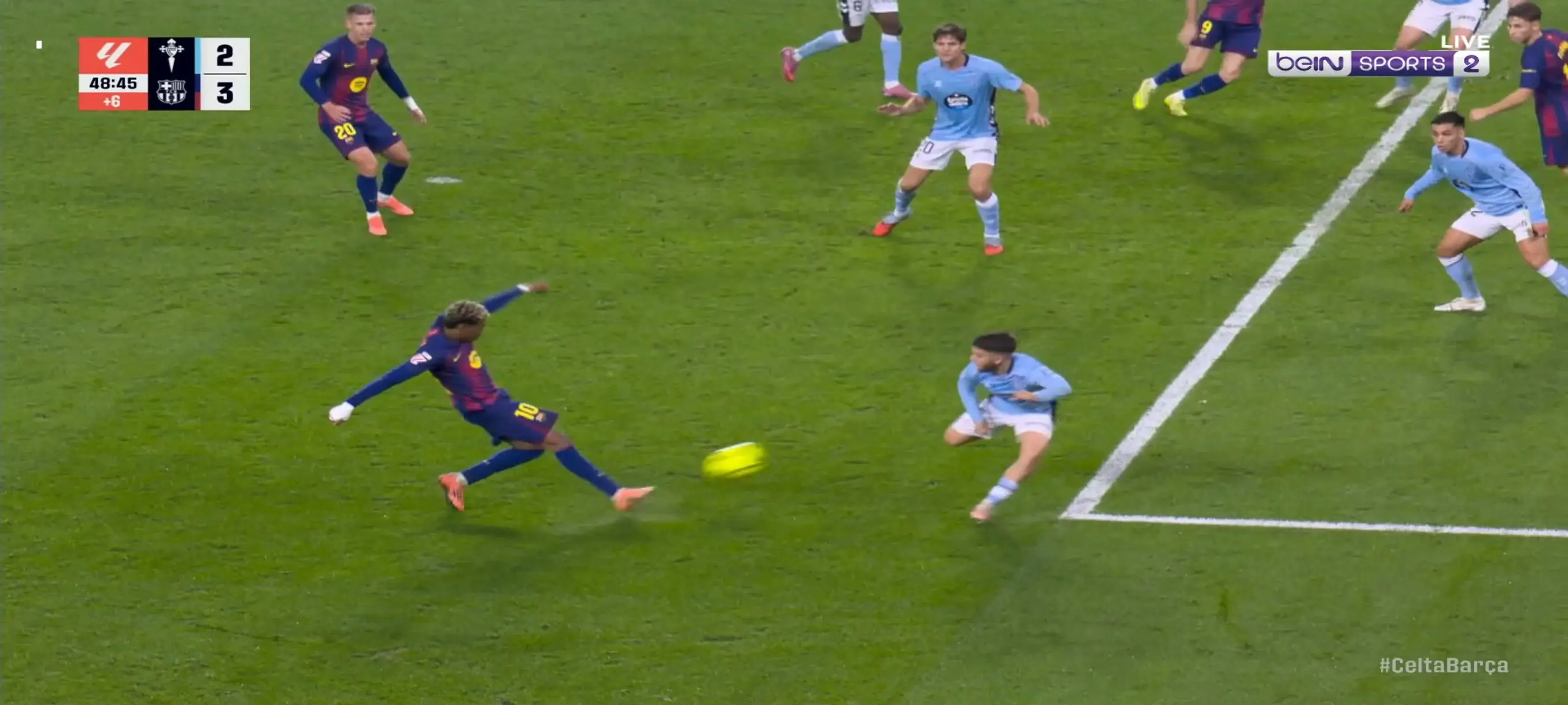 The first half became a shootout of goals. Lewandowski, recovering his scoring instinct, extended the lead in the 37th minute with a spectacular volley assisted by Frenkie de Jong (2-1), demonstrating why he is still the Polish killer at 37 years old. But Celta did not give up: in the 43rd minute, Borja Iglesias unleashed a missile from outside the area that slipped into the top corner, grazing the crossbar and causing Balaídos to explode (2-2). A tie seemed inevitable on the brink of half-time, with the referee adding six minutes of added time for interruptions. It was then that Yamal’s genius emerged.