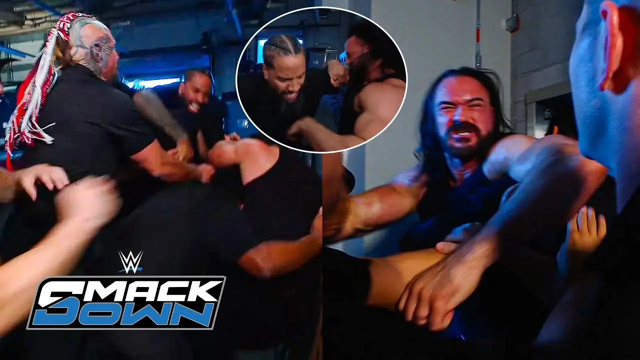 Last night on the latest episode of WWE SmackDown (October 24 2025), the atmosphere backstage turned chaotic when Jimmy Uso blindsided Drew McIntyre in a heated confrontation that further escalates one of WWE’s most unpredictable recent narratives. According to the official post-show highlight released by WWE, the brawl happened after tensions sparked at ringside spilled over into the backstage corridors.