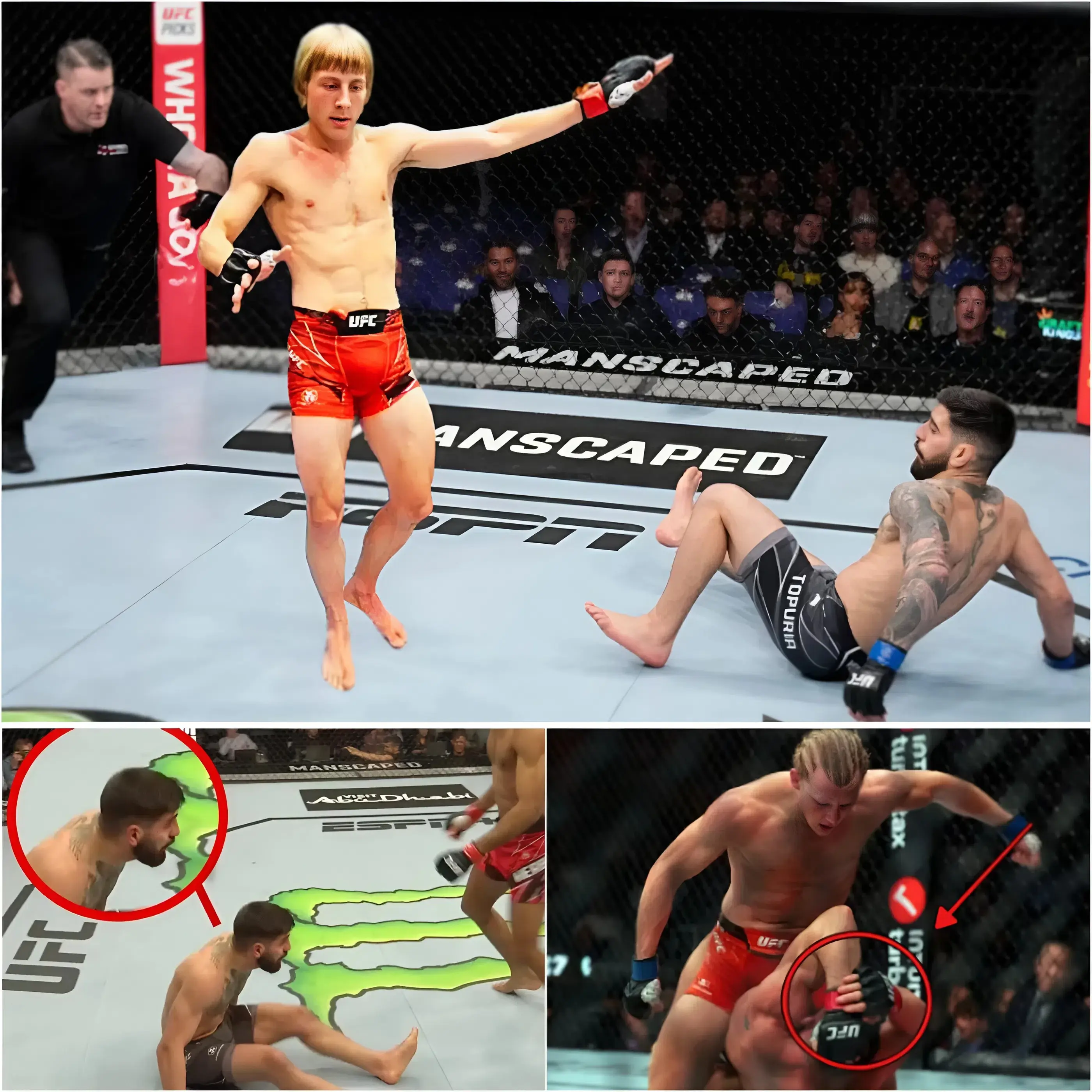 Two minutes into the round, Paddy executed a perfect setup. A feint to the body drew Topuria’s guard downward, and then — with a snap that echoed across the arena — came a devastating overhand right. The punch landed flush on Topuria’s jaw, sending him crashing to the canvas. For a brief moment, time froze. Then Pimblett pounced, delivering a flurry of strikes that forced the referee to step in.